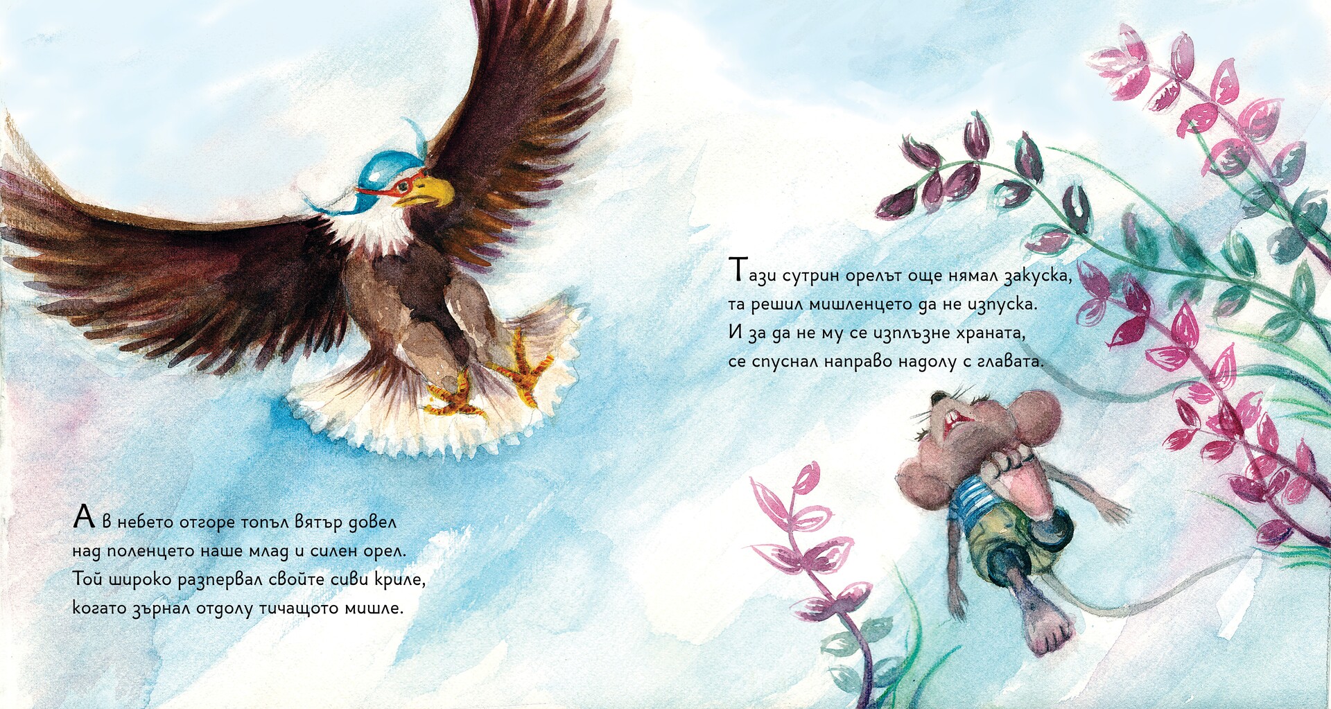 Орел и котка едновременно връхлитат върху мишле, при което едва не се сблъскват. Така мишлето се спасява по щастлива случайност, но решава че орелът му е помогнал и тръгва да го търси, за да му благодари. Пътуването ще му донесе други премеждия и израстване.